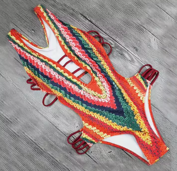 Deze sexy monokini heeft een diepe V-hals met meerdere bandjes, uitsneden bij de taille, racerback, normale snit onderaan en een kleurrijke print.