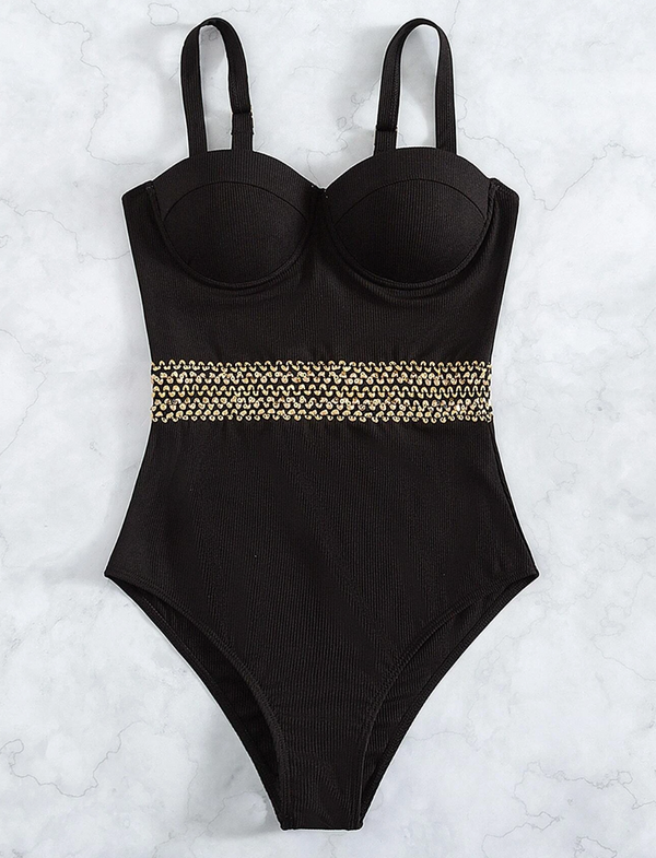 Dit zwarte badpak met decoratieve tailleband biedt een stijlvolle en flatterende look. Perfect voor een luxe stranddag, gemaakt van comfortabel en sneldrogend materiaal. Ontdek onze elegante badmode collectie.