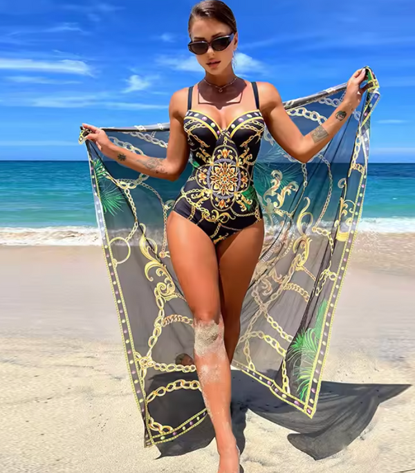 Dit stijlvolle zwarte badpak met kettingprint en bijpassende omslagdoek is perfect voor een luxe stranddag. Gemaakt van hoogwaardige stoffen, biedt het zowel comfort als een elegante uitstraling.