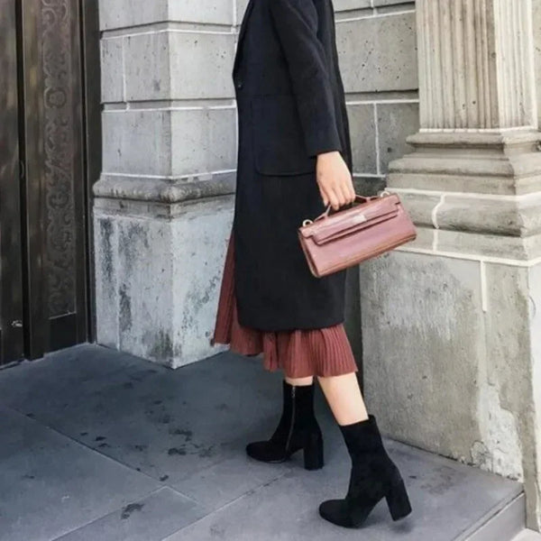 Deze zwarte suède enkellaarzen voor dames hebben een stijlvolle halfhoge schacht en een comfortabele blokhak. Gemaakt van hoogwaardig suède, perfect voor zowel casual als formele gelegenheden. De ritssluiting zorgt voor een goede pasvorm, en de blokhak biedt de hele dag comfort.